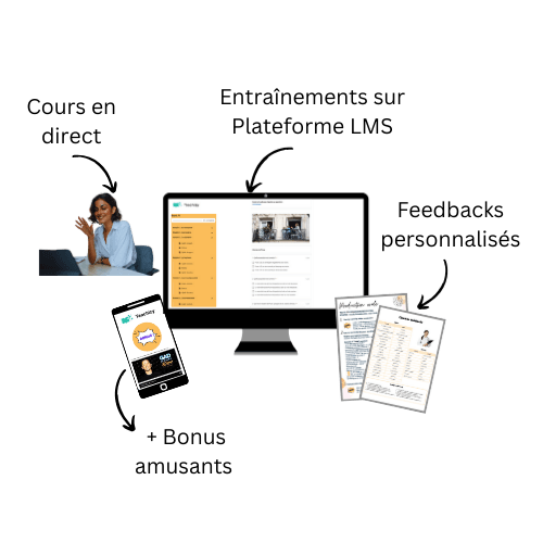 Tu combines des cours en direct avec moi et du travail personnel guidé chez toi sur une plateforme.